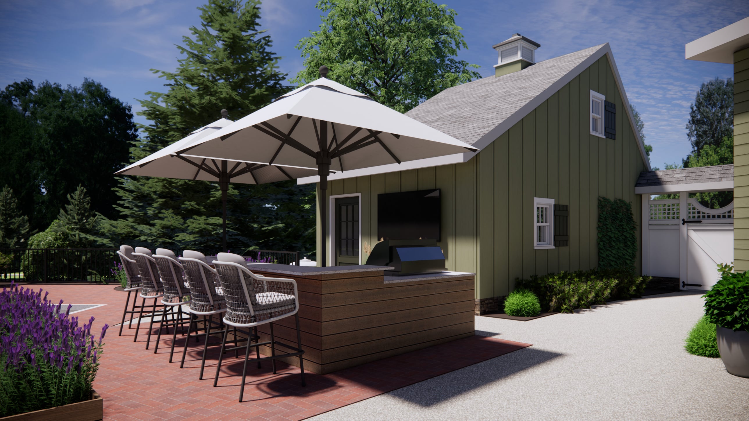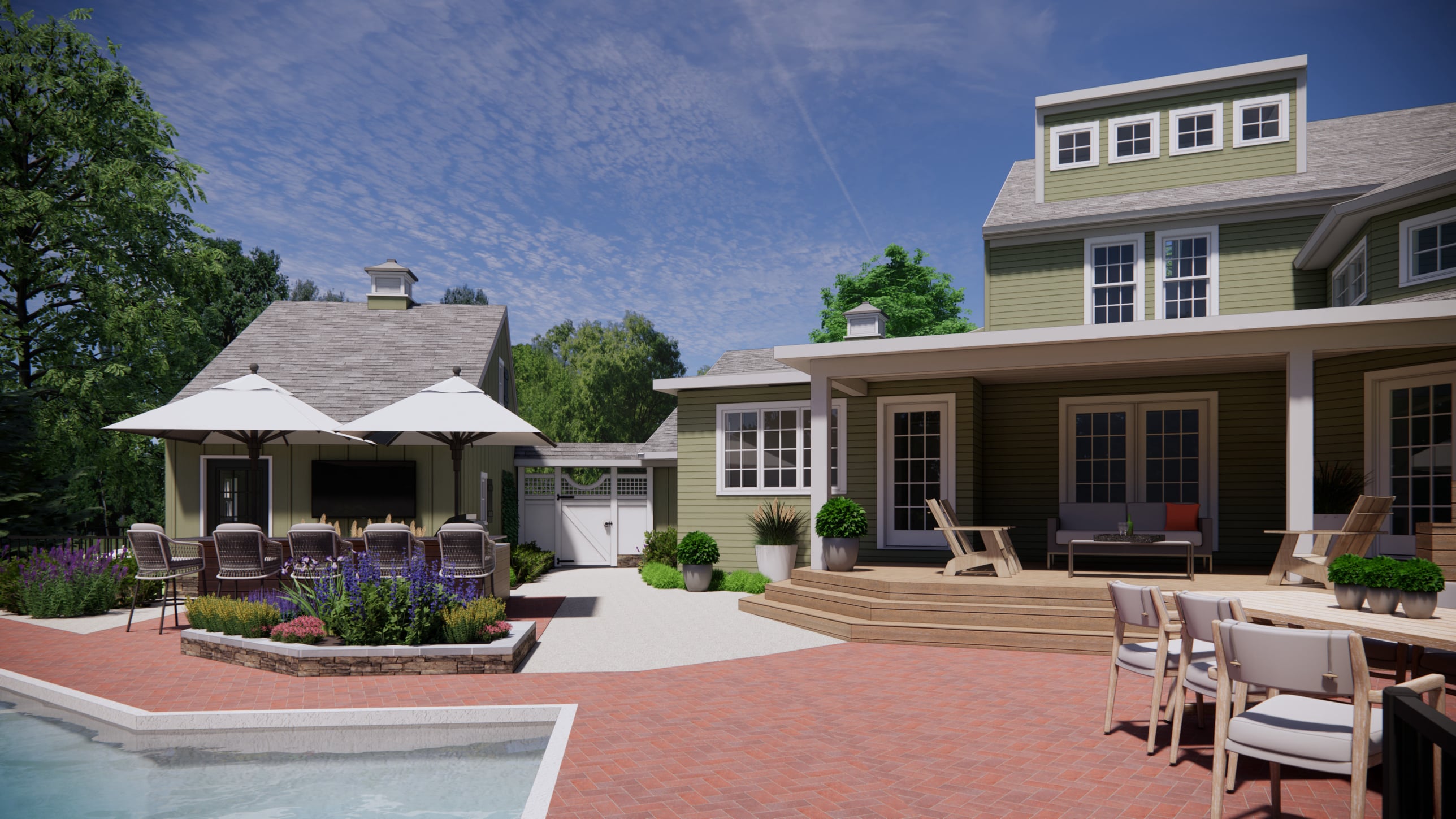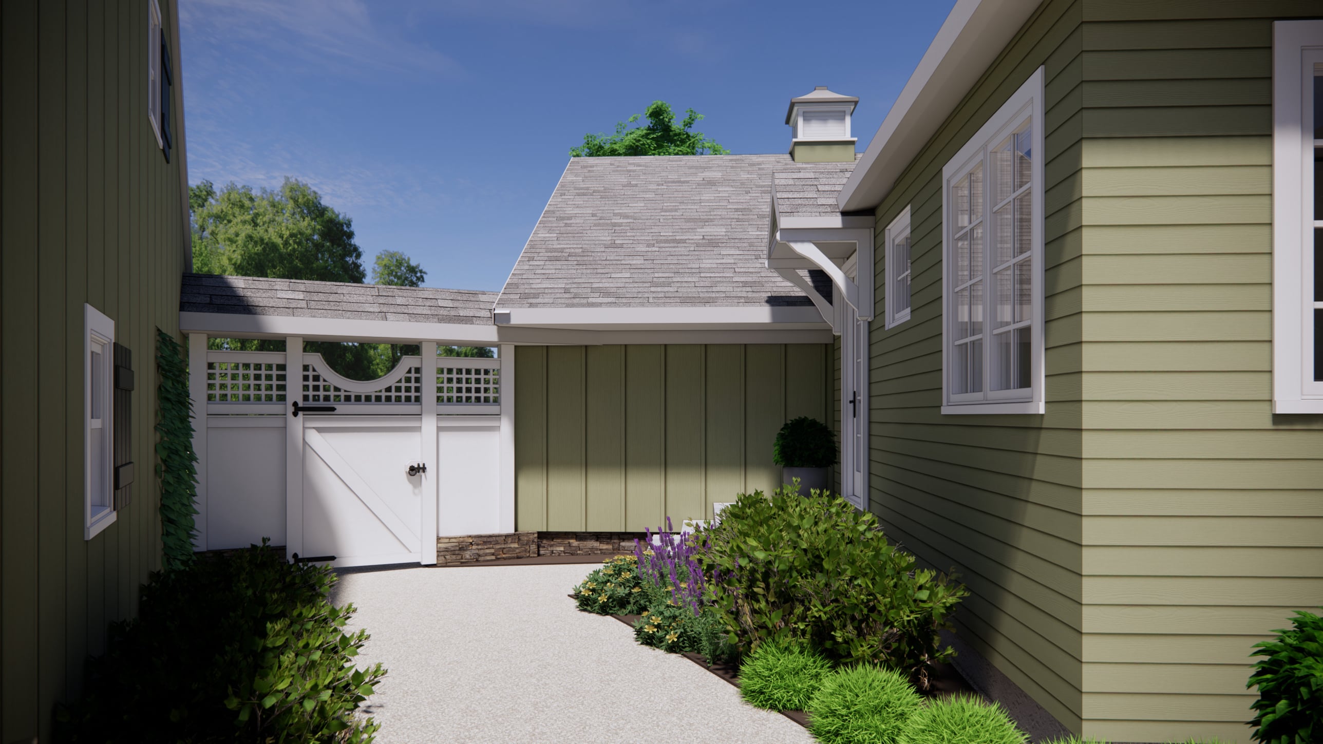 The renovation also includes a new roof over the existing rear deck and an outdoor kitchen that engages the rear yard and pool, supporting the family’s outdoor lifestyle. Both the addition and the new garage were designed to complement the home’s architectural style, while the existing garage was enhanced with a new cupola, garage doors, and pent roof to match the new carriage house. A private side gate and screen wall connect the new garage to the existing house and garage, creating an intimate side entry to the home and rear pool area from the existing parking area.