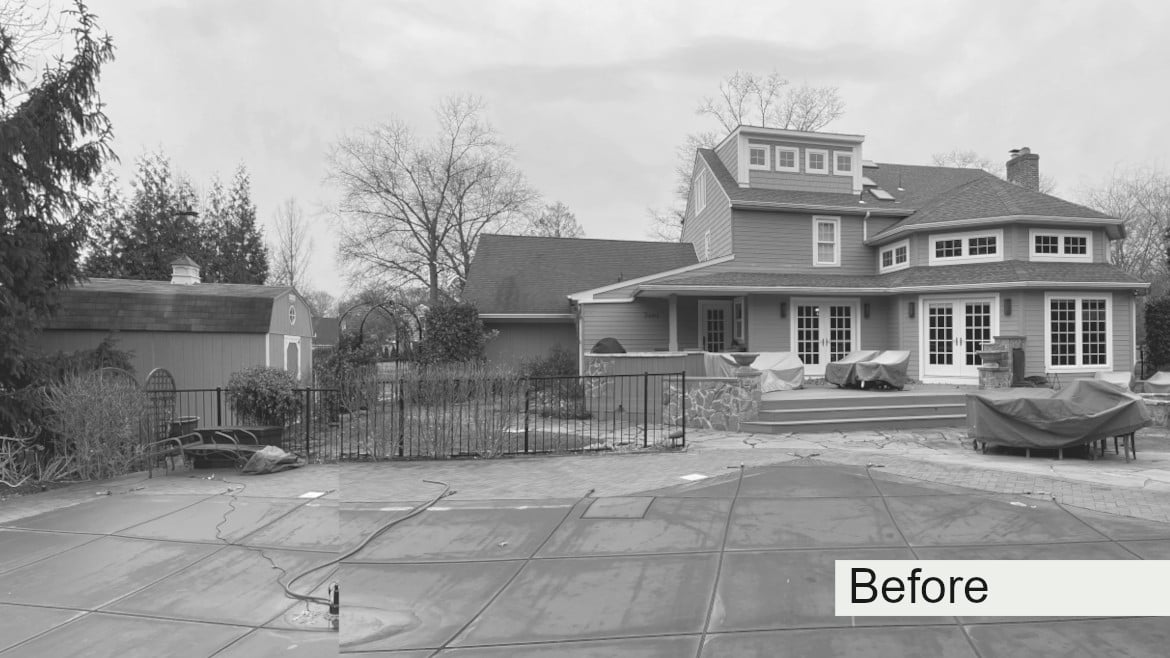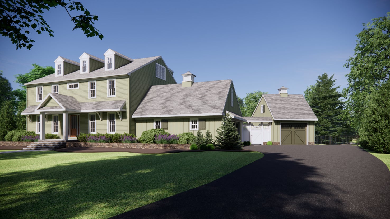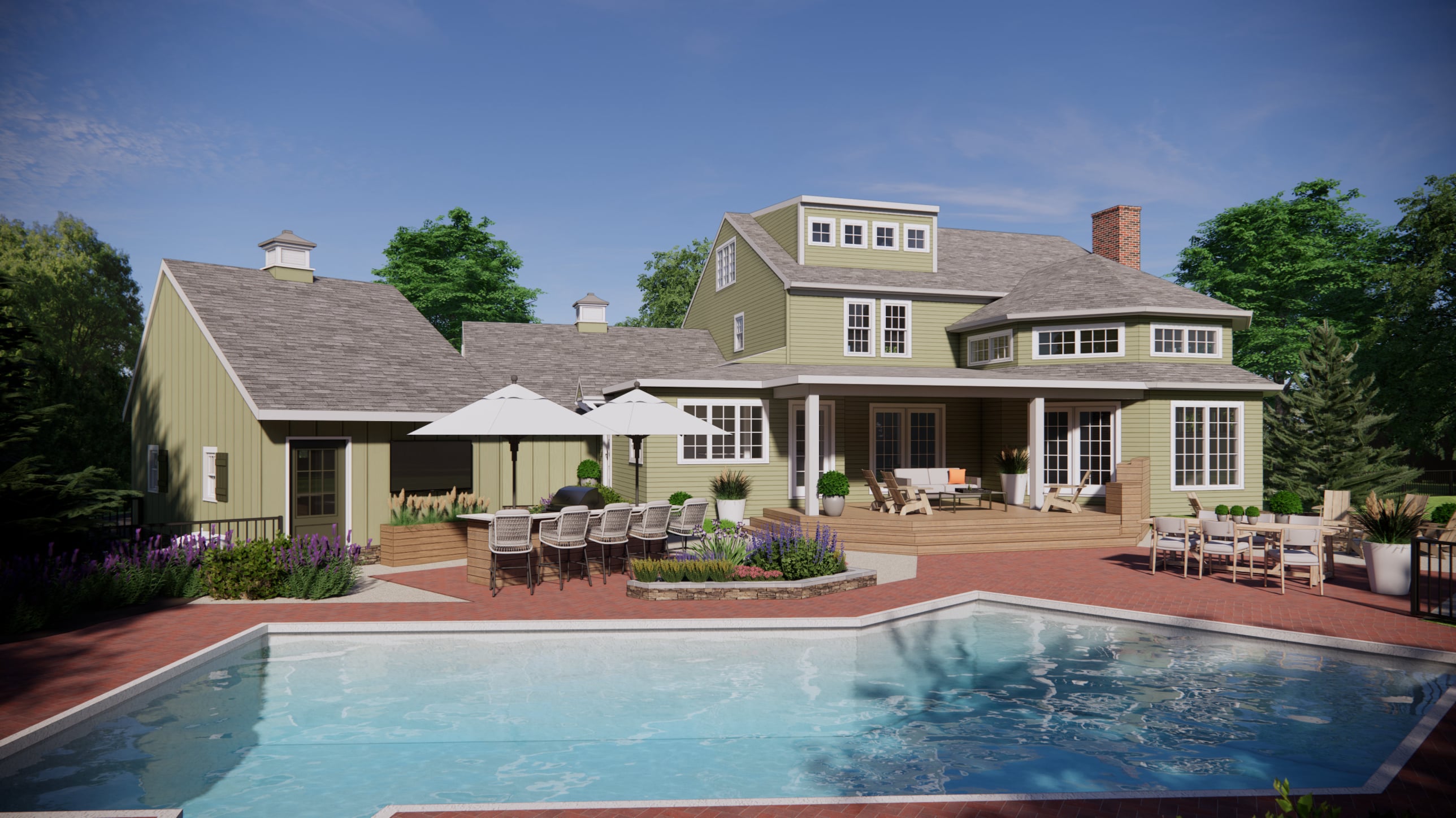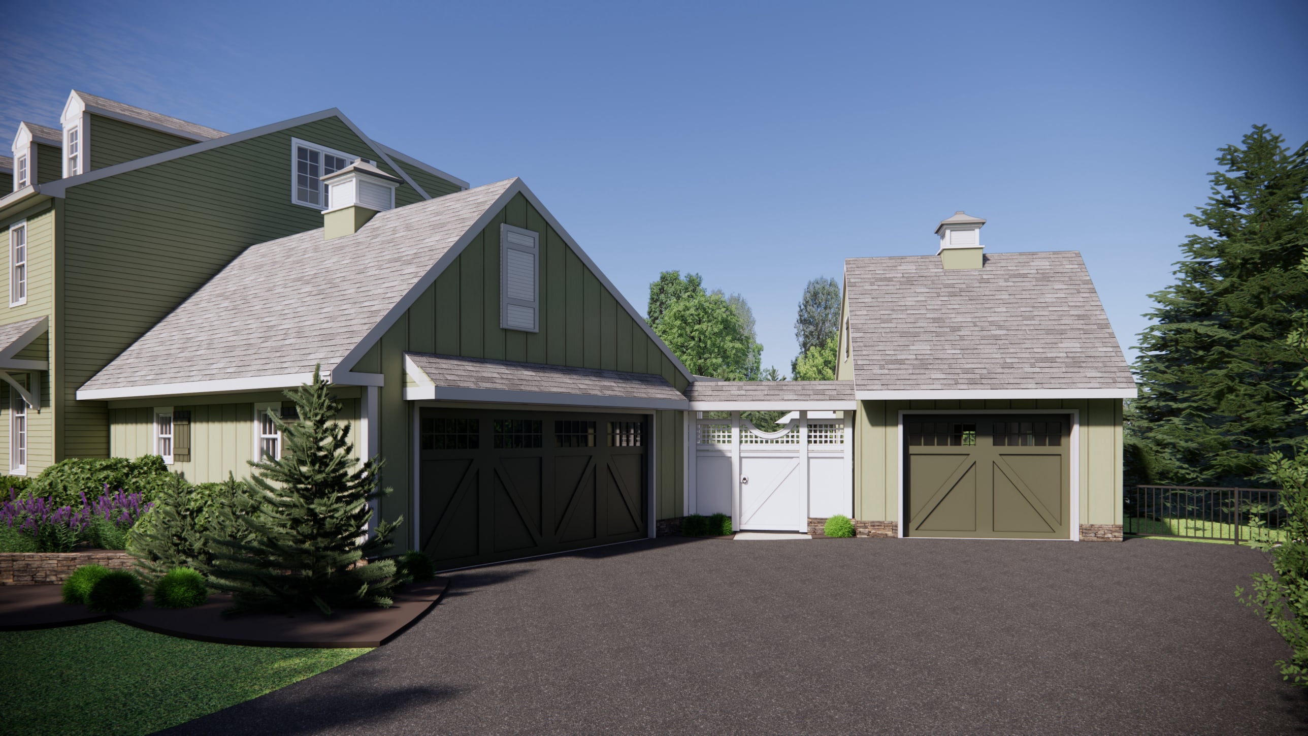 The renovation also includes a new roof over the existing rear deck and an outdoor kitchen that engages the rear yard and pool, supporting the family’s outdoor lifestyle. Both the addition and the new garage were designed to complement the home’s architectural style, while the existing garage was enhanced with a new cupola, garage doors, and pent roof to match the new carriage house. A private side gate and screen wall connect the new garage to the existing house and garage, creating an intimate side entry to the home and rear pool area from the existing parking area.