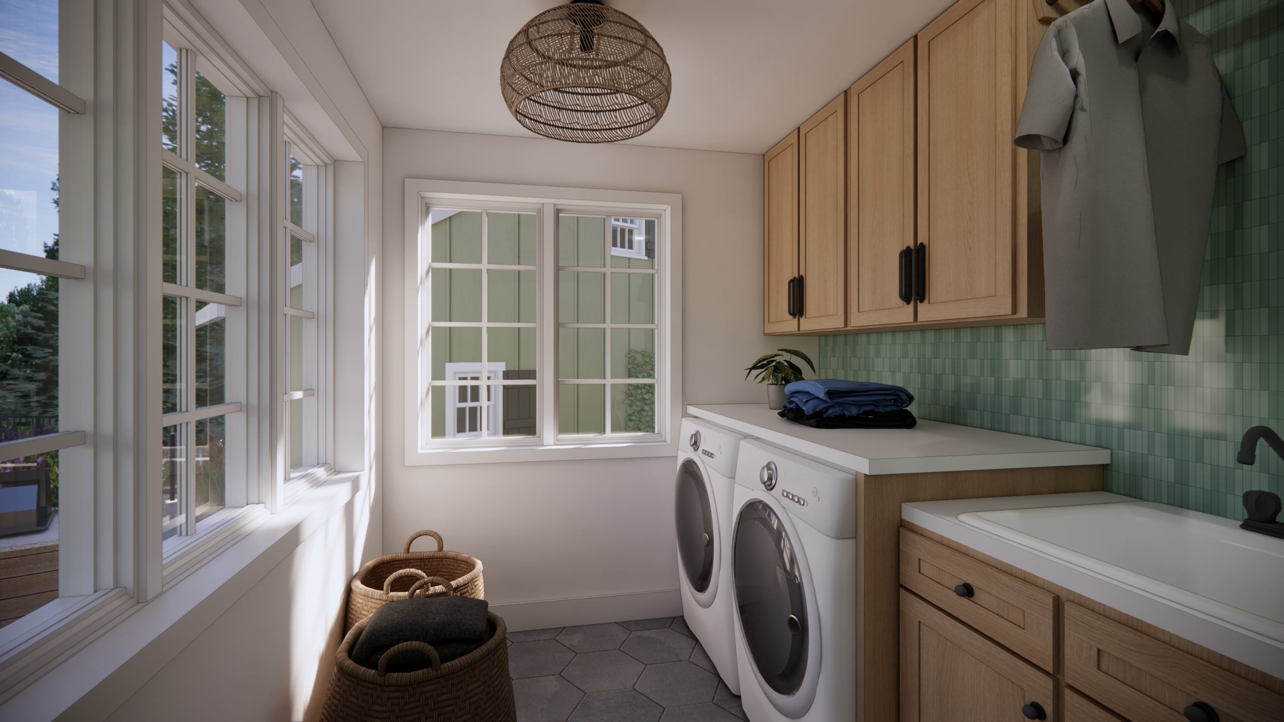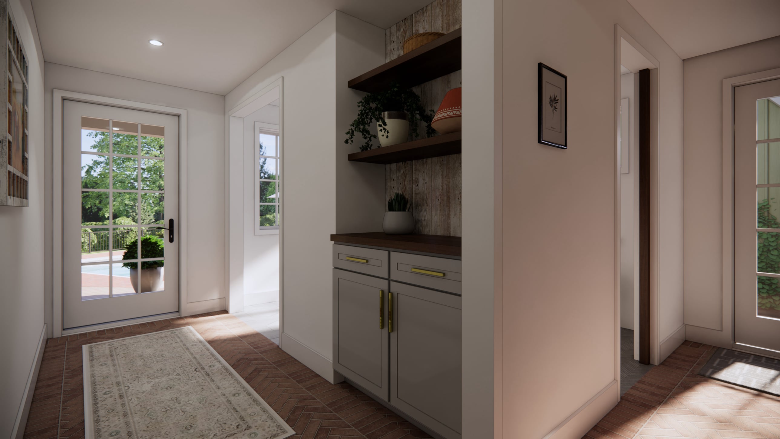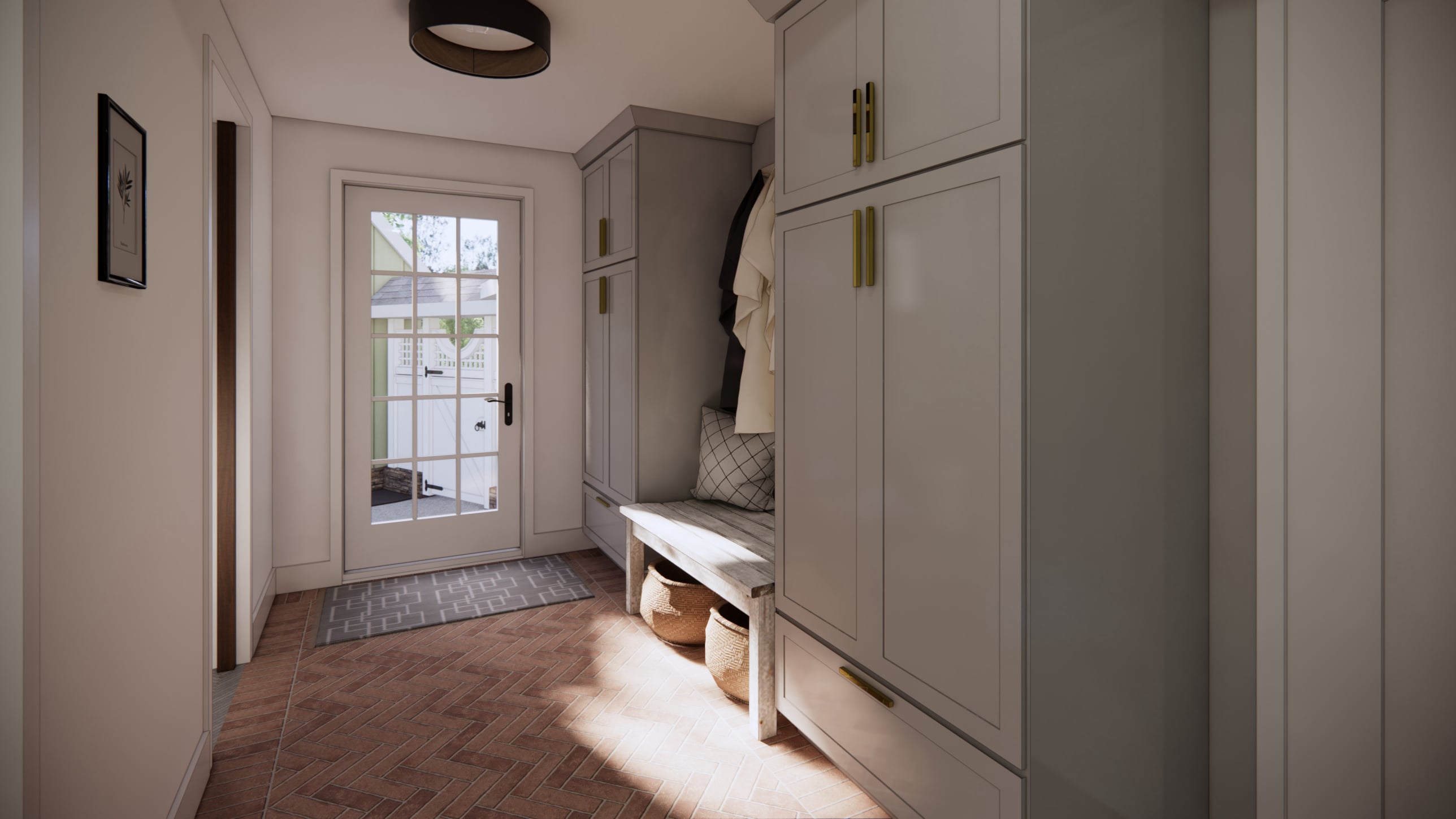 A carriage house–style garage addition was added to an existing home, providing both needed parking and increased privacy for the rear pool and patio from the street. A small addition to the house accommodates a decompressed laundry room, mudroom, and powder room, enhancing functionality for the family’s daily routines.